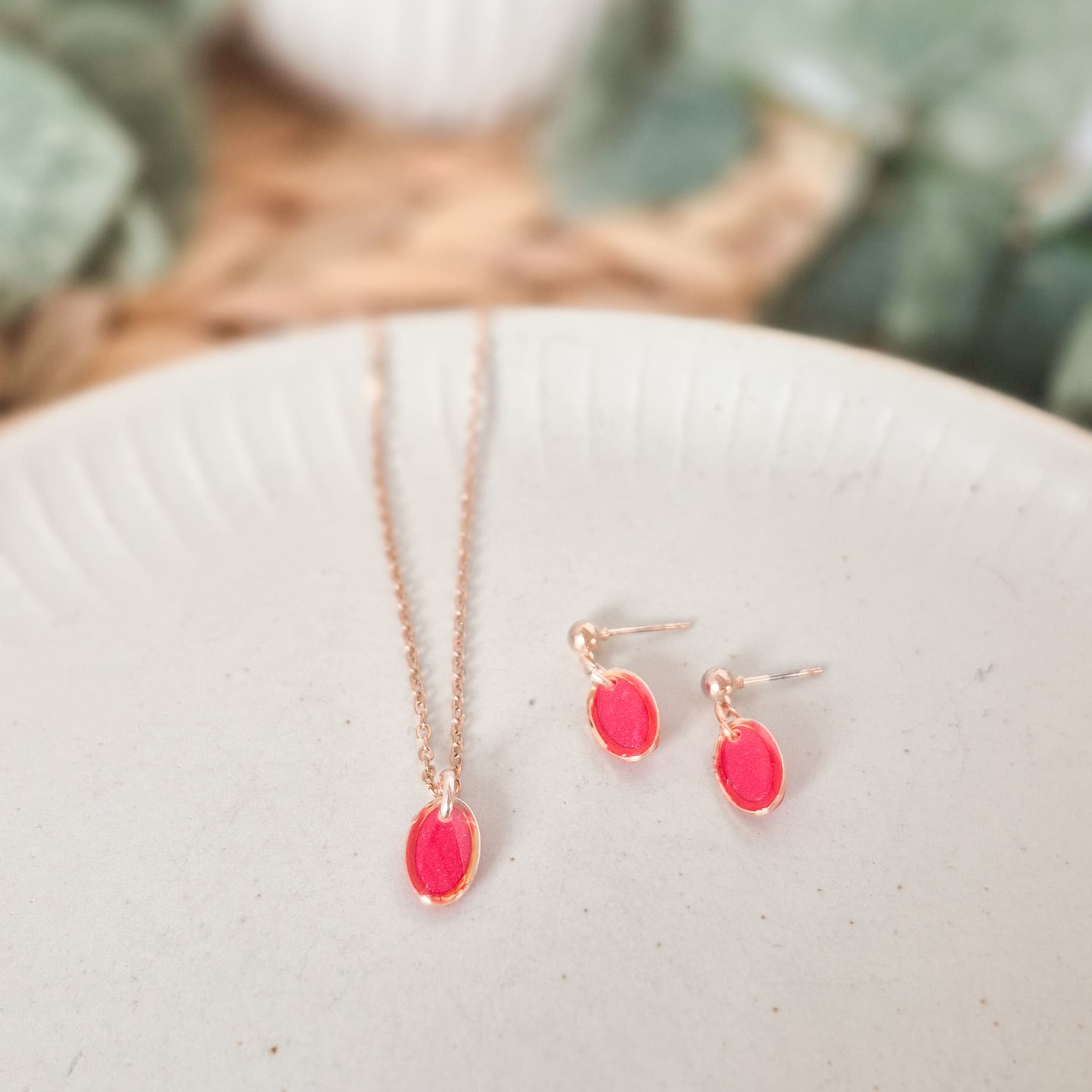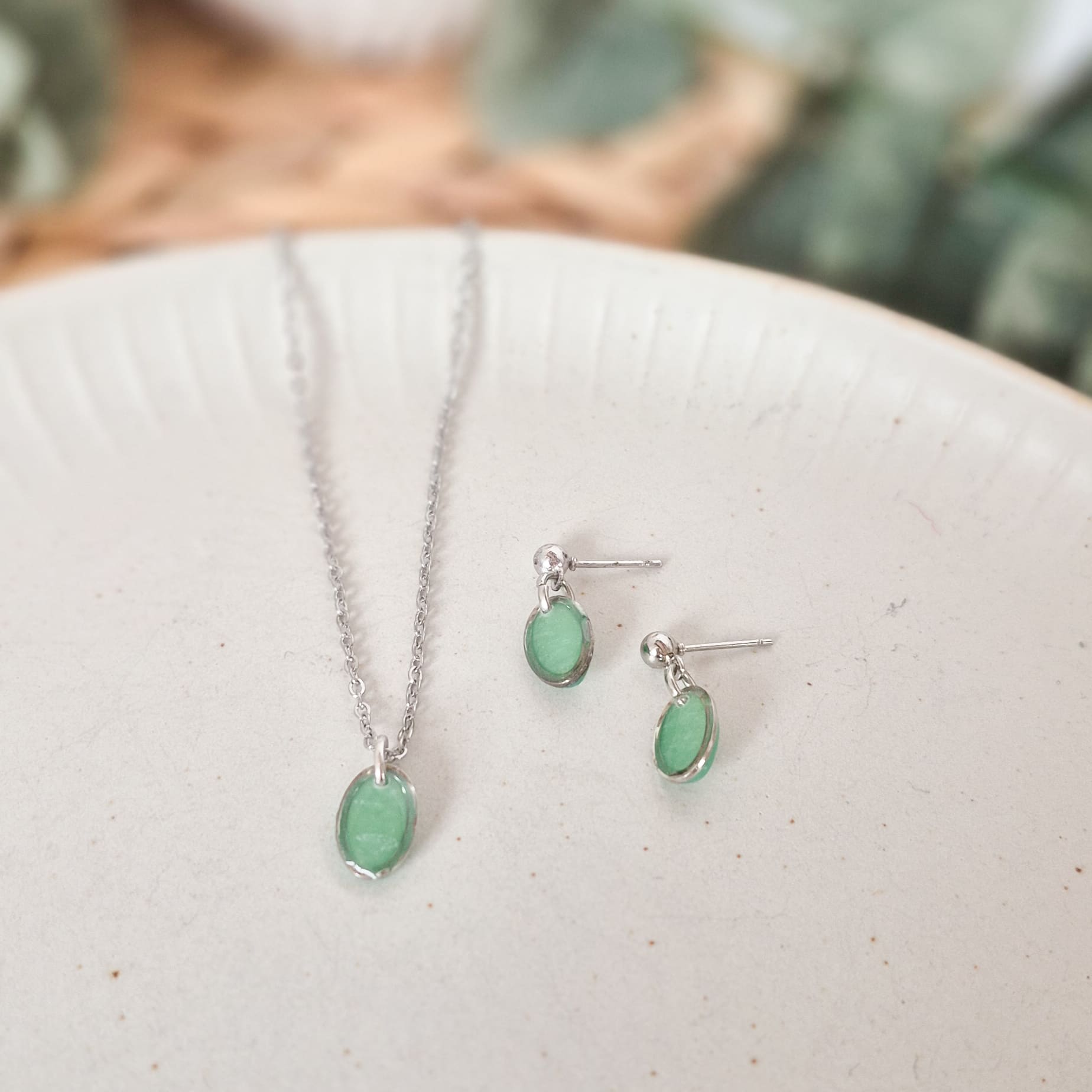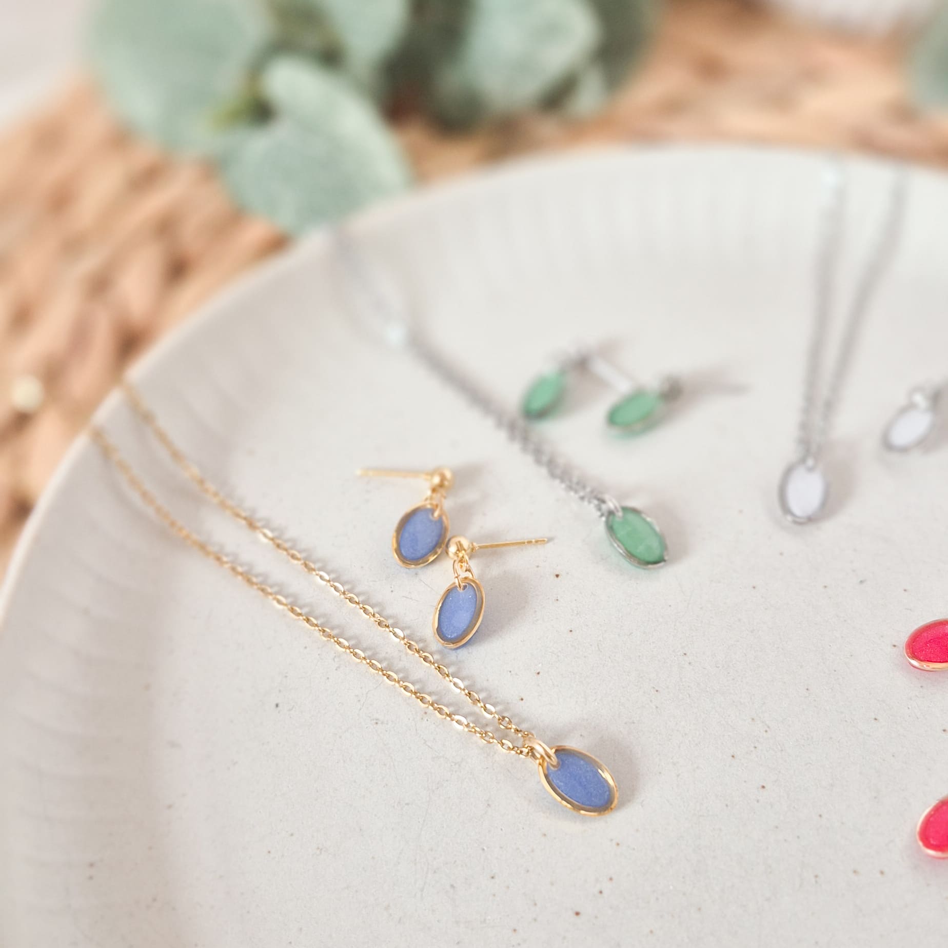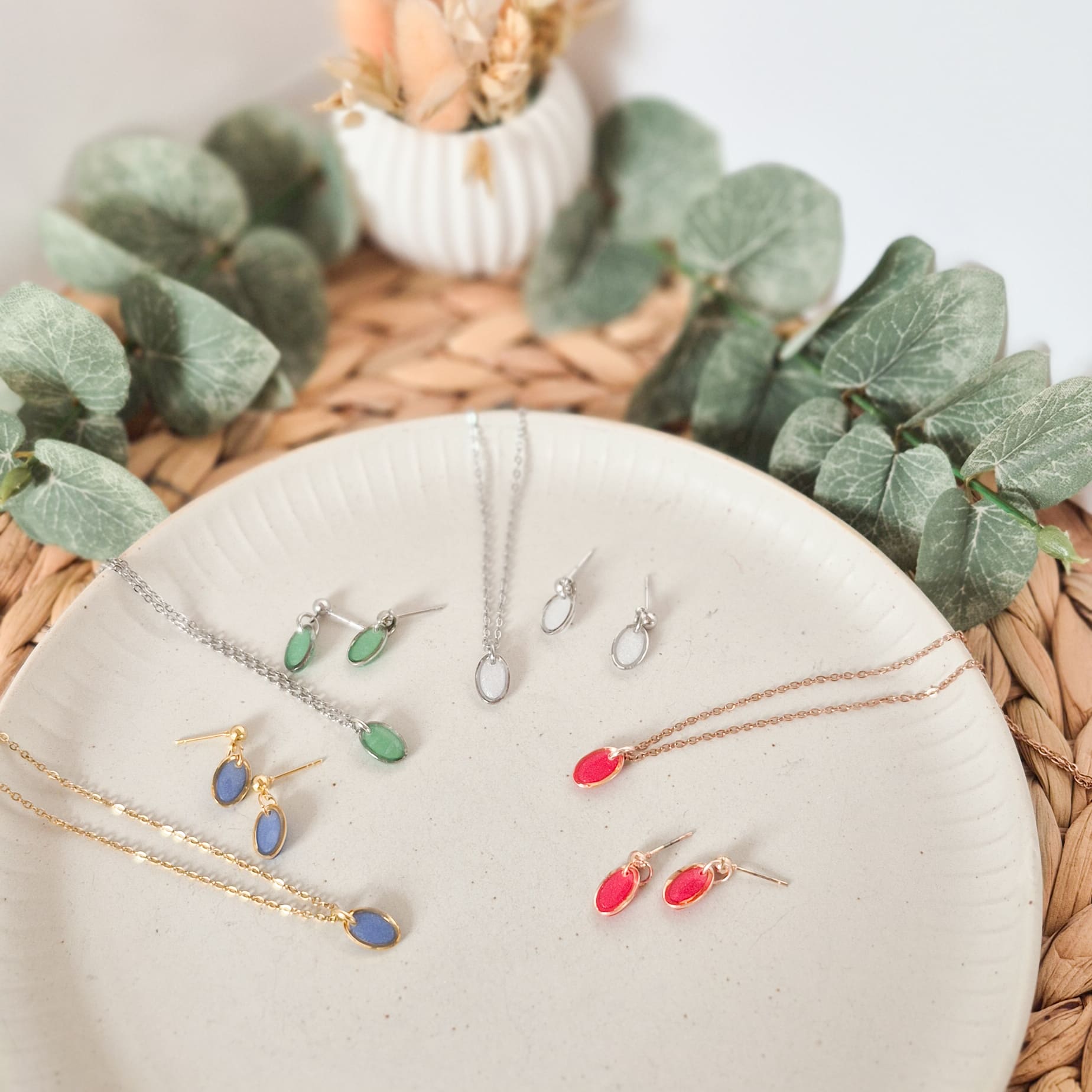 Diese Ohrringe und Halsketten mit kleinem ovalem Anhänger sind die perfekten Schmuckstücke für alle, die es fein und zart lieben! Es gibt sie in vier verschiedenen Farben: Smaragd, Granat, Saphir und Kristall.