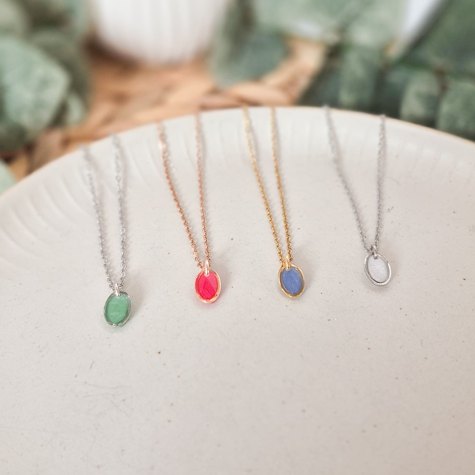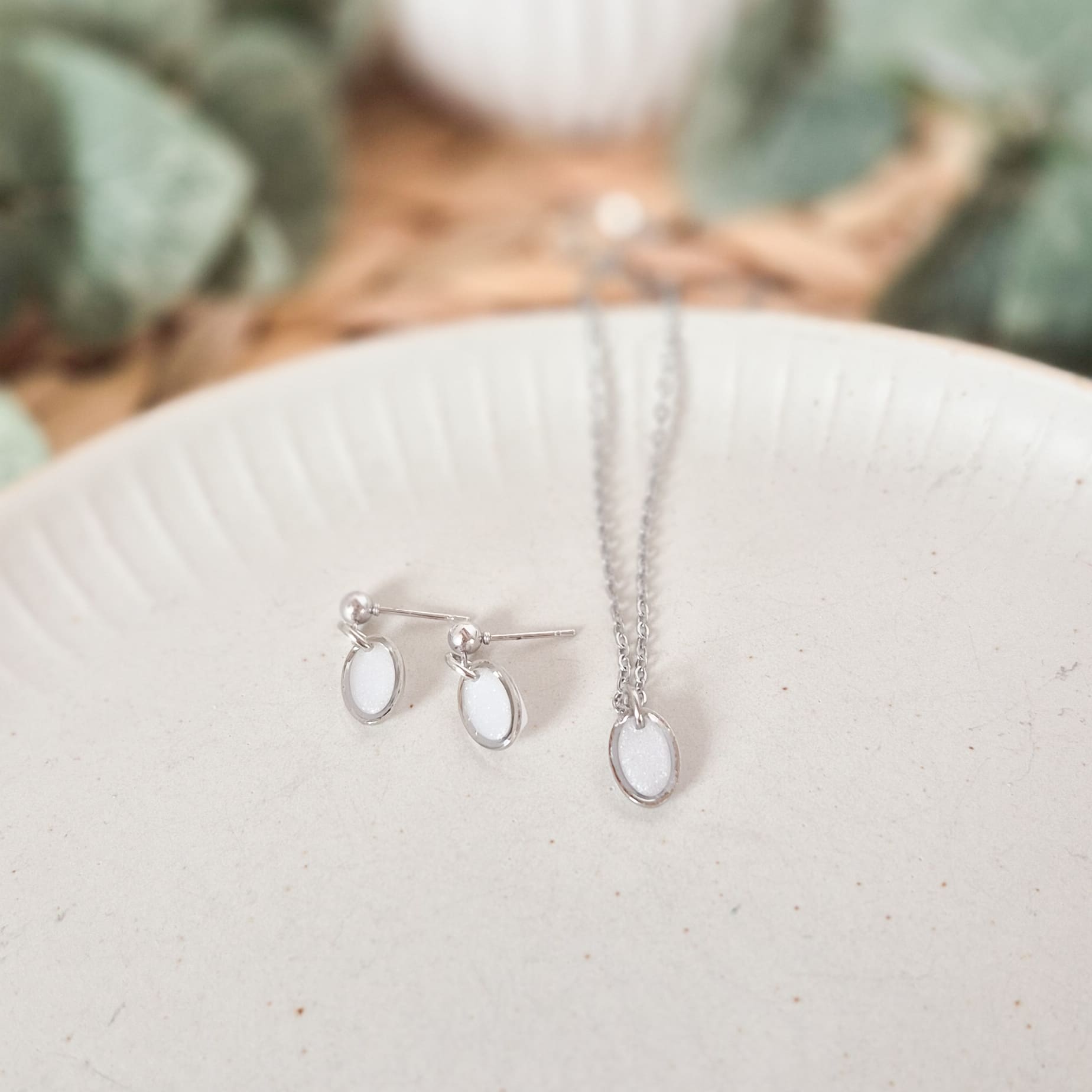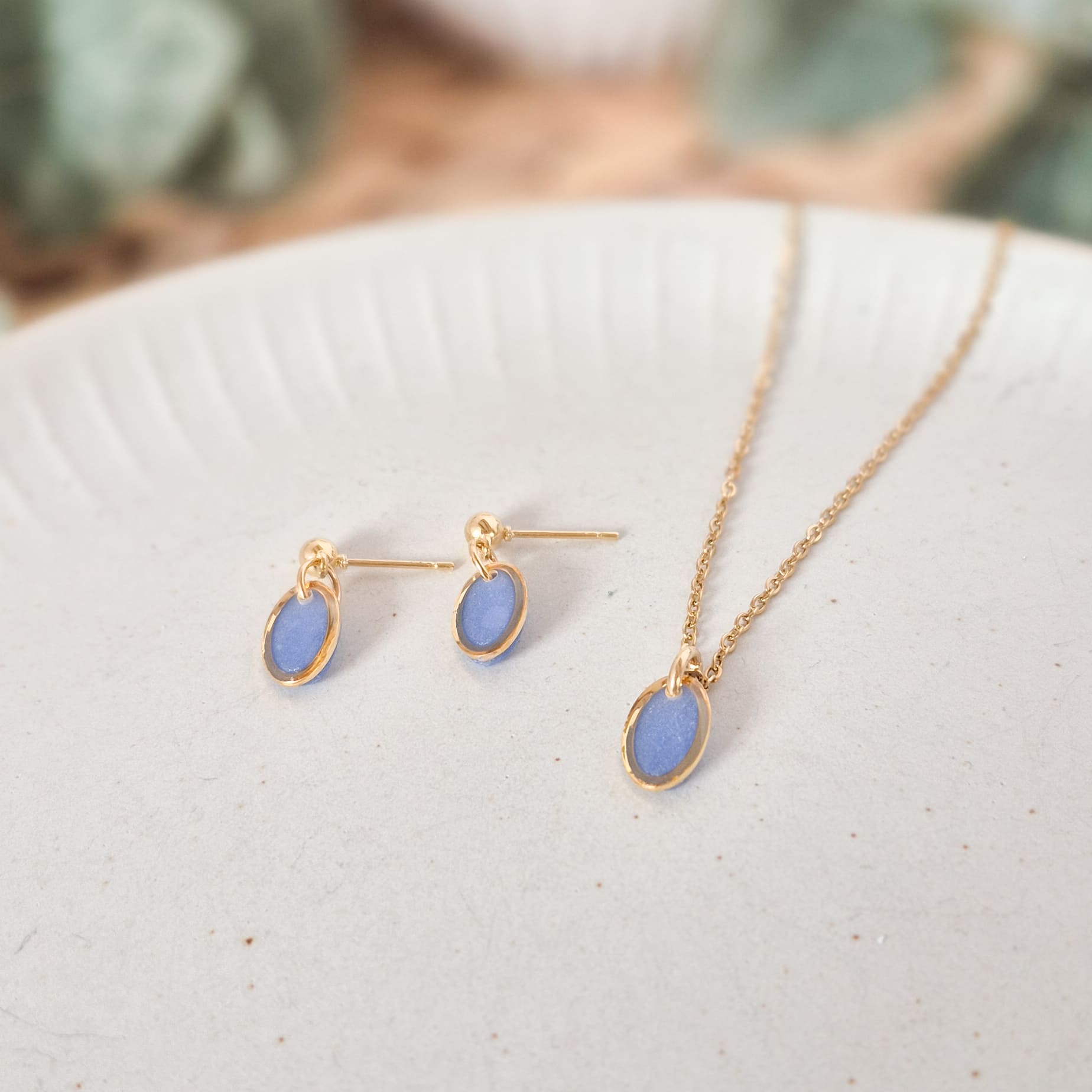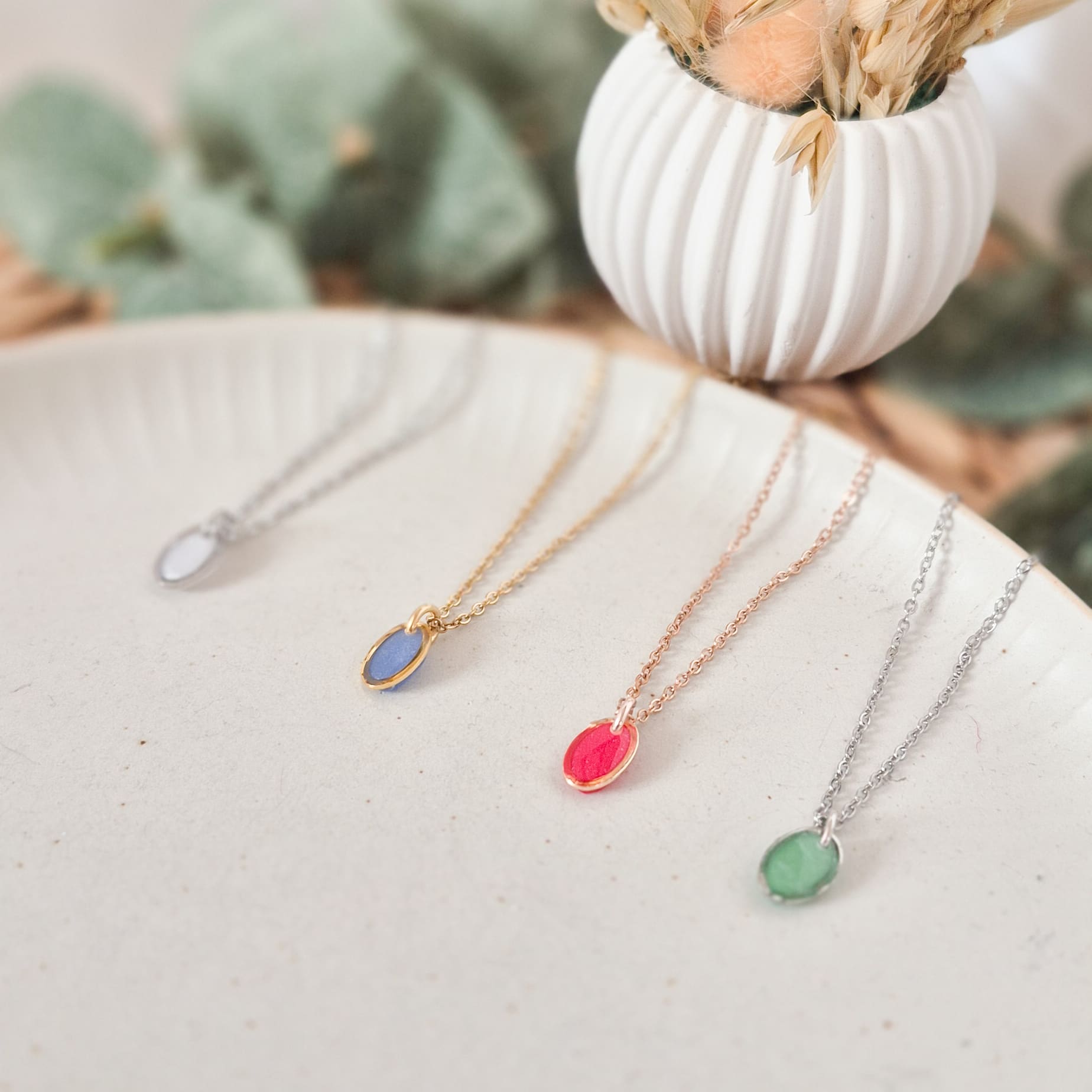 Diese Ohrringe und Halsketten mit kleinem ovalem Anhänger sind die perfekten Schmuckstücke für alle, die es fein und zart lieben! Es gibt sie in vier verschiedenen Farben: Smaragd, Granat, Saphir und Kristall.