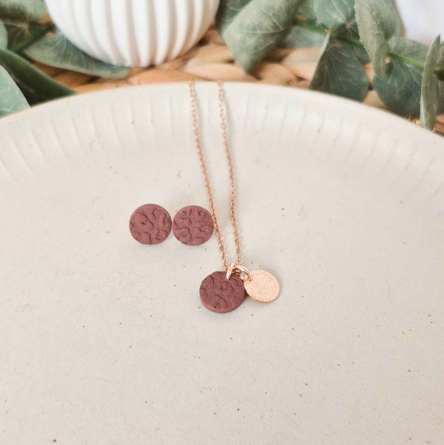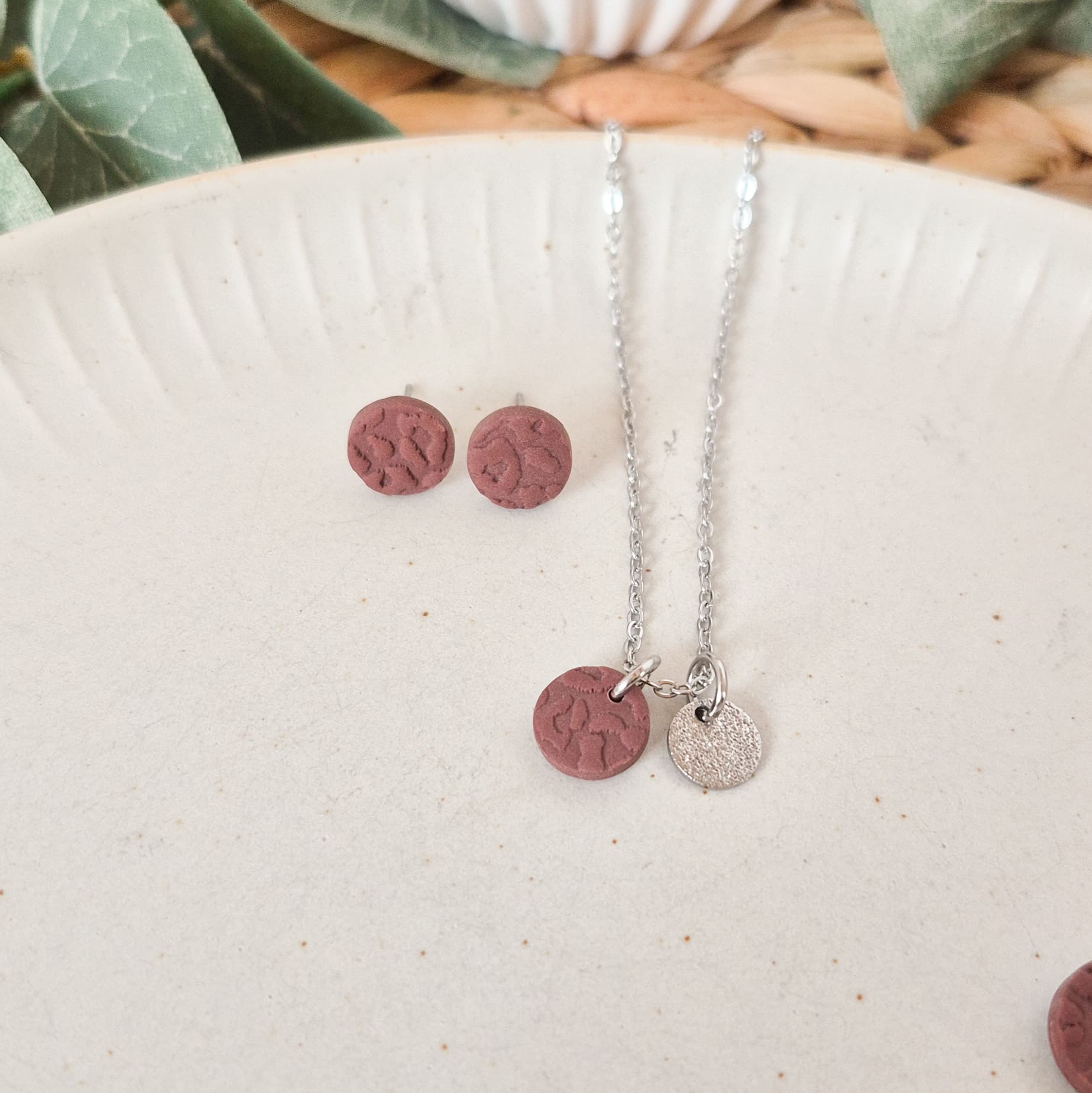 Verwendete Materialien: Polymer Ton, Ohrstecker und Kette aus Edelstahl, Verbindungsringe aus Messing/Edelstahl, Zierplättchen aus Edelstahl