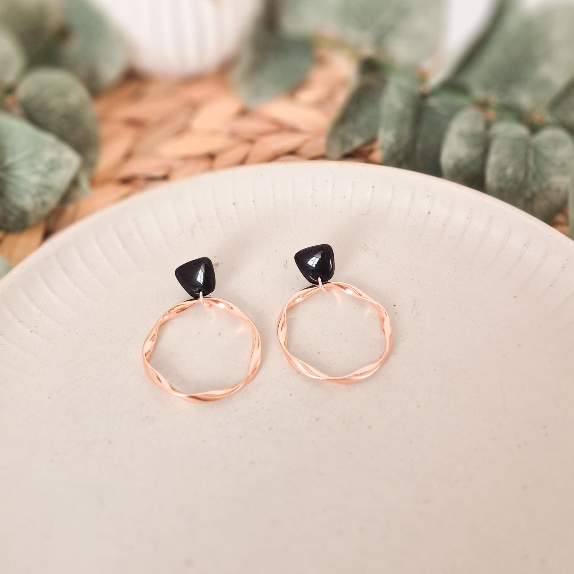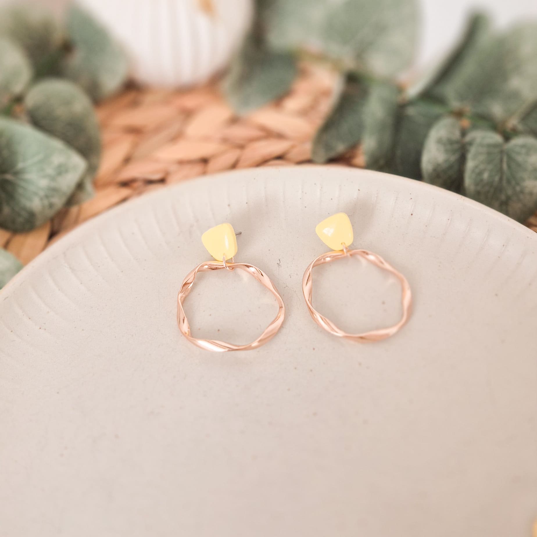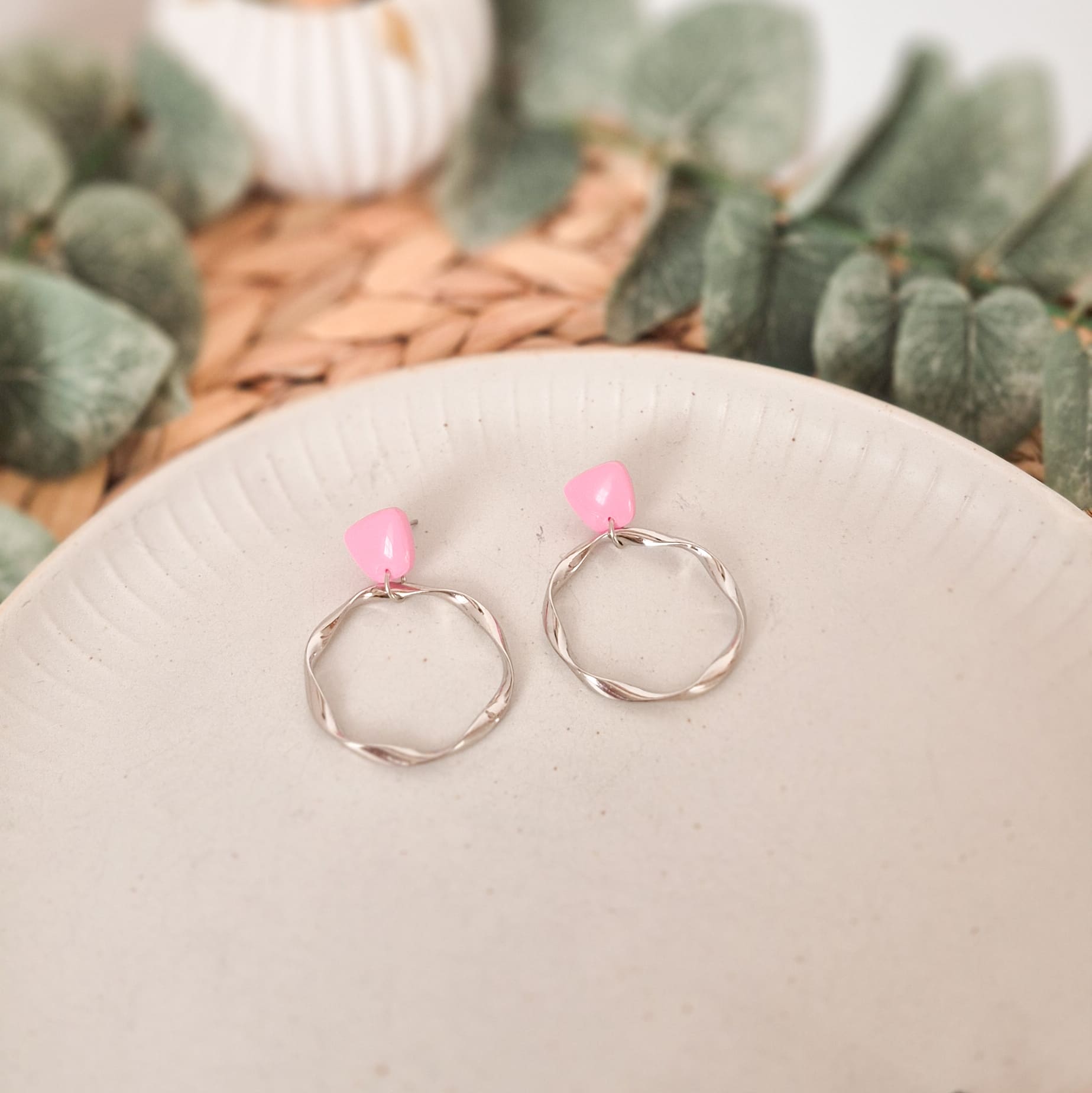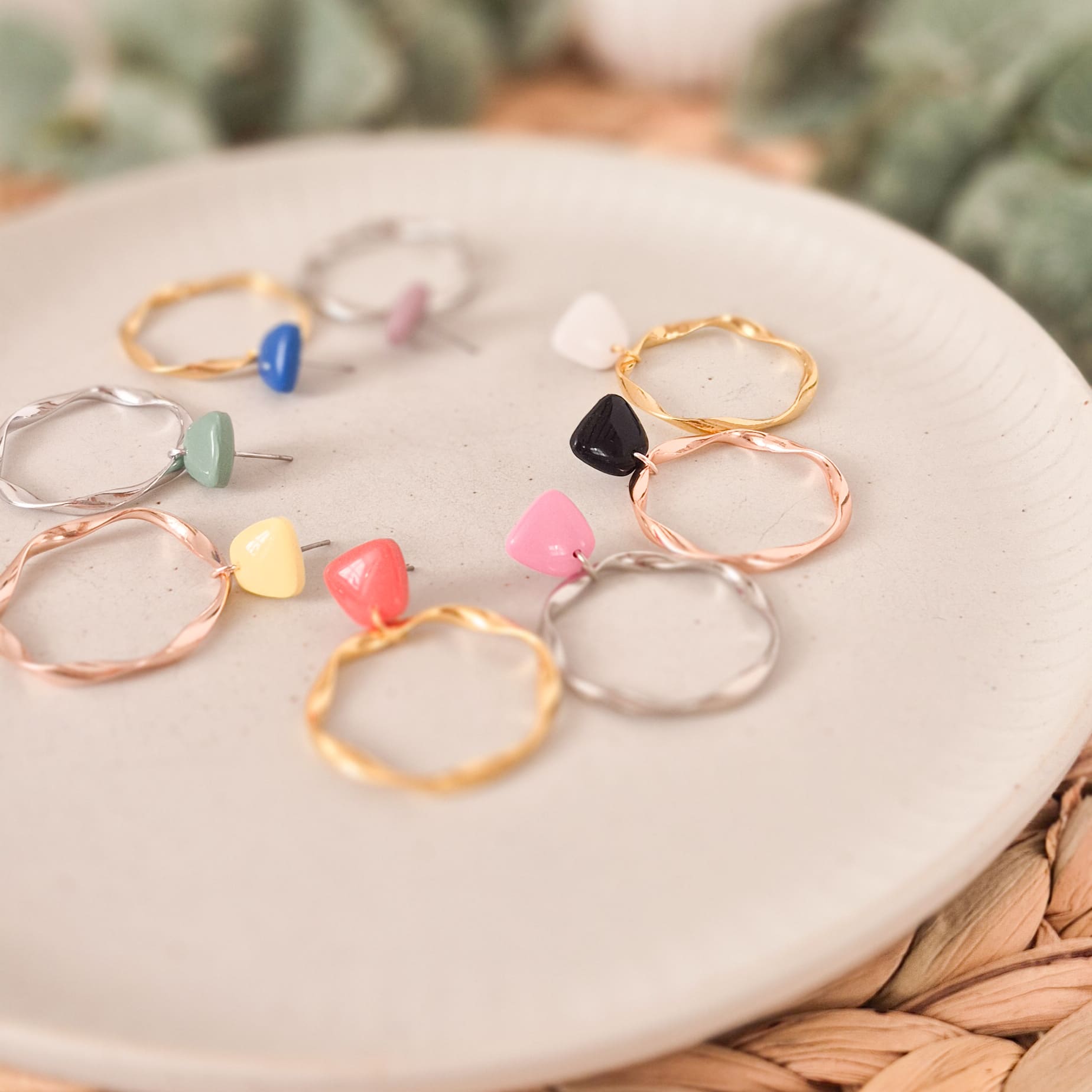 Farbenfrohe Stecker mit gedrehtem Ring in deiner Wunsch-Metallfarbe – die perfekten Ohrringe für jeden Anlass! Es gibt sie in folgenden Farben: Royalblau, Eukalyptusgrün, Buttergelb, Malve, Pink, Orange-Rot, Schwarz und Weiß.