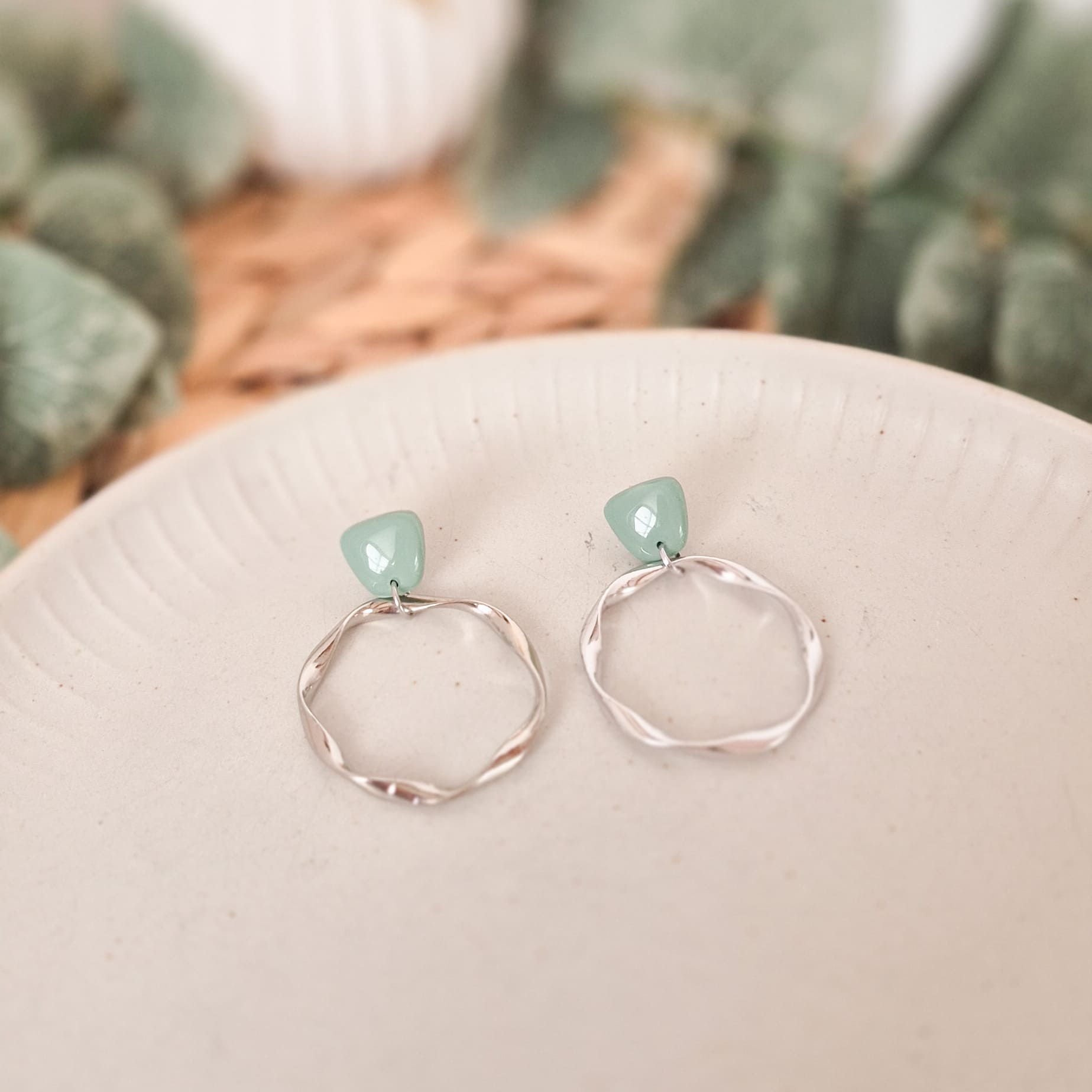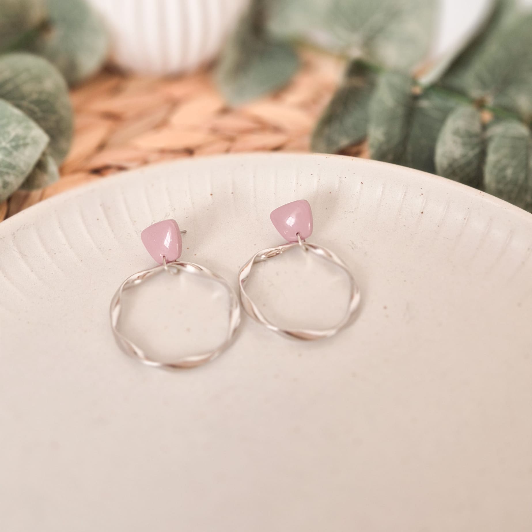 Verwendete Materialien: Polymer Ton, Ohrstecker aus Edelstahl, Verbindungsring und gedrehter Ring aus Messing, UV-Harz