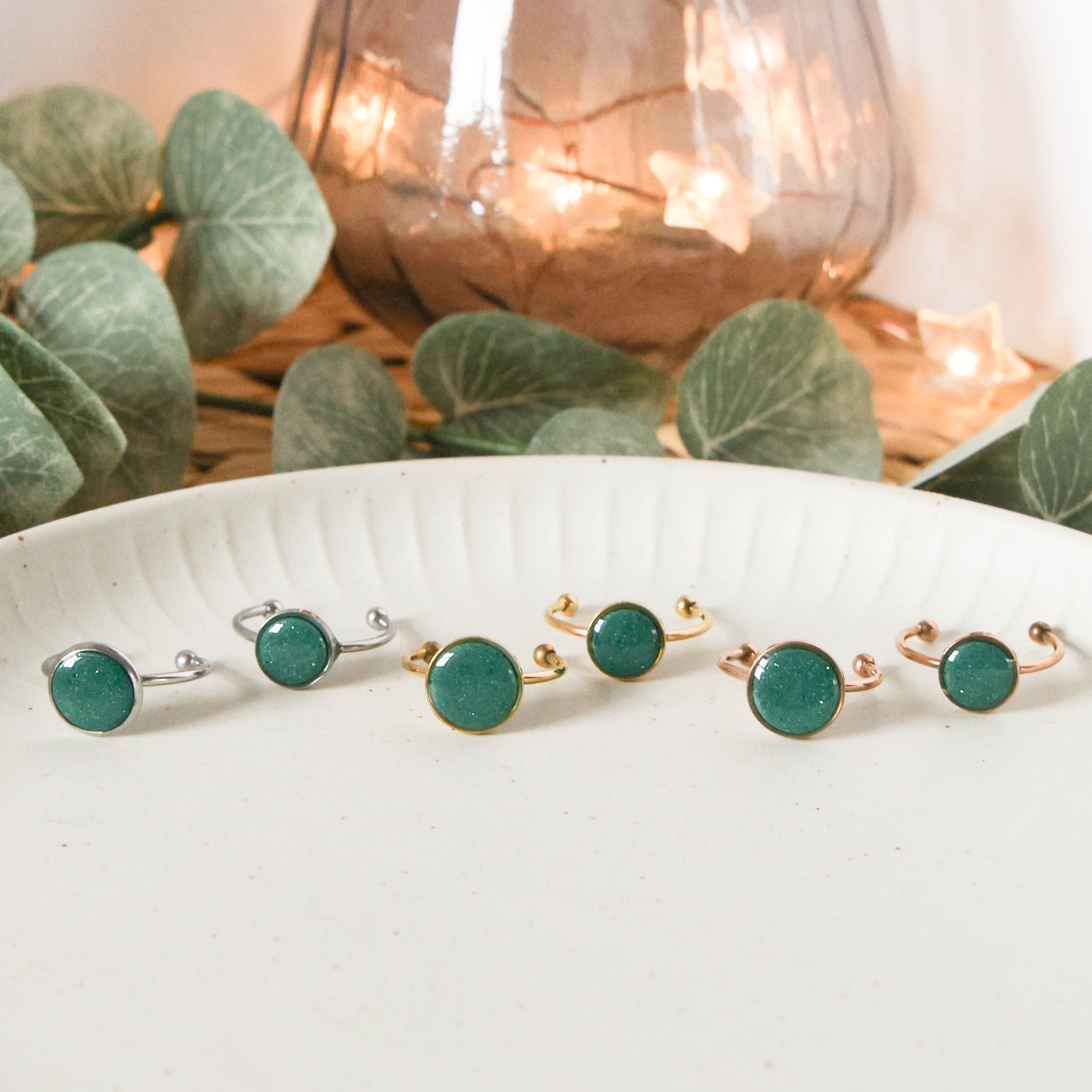 Die Ringe sind aus Edelstahl und variabel in der Größe verstellbar. Die grünen Plättchen gibt es in zwei verschiedenen Größen: 12mm und 10mm