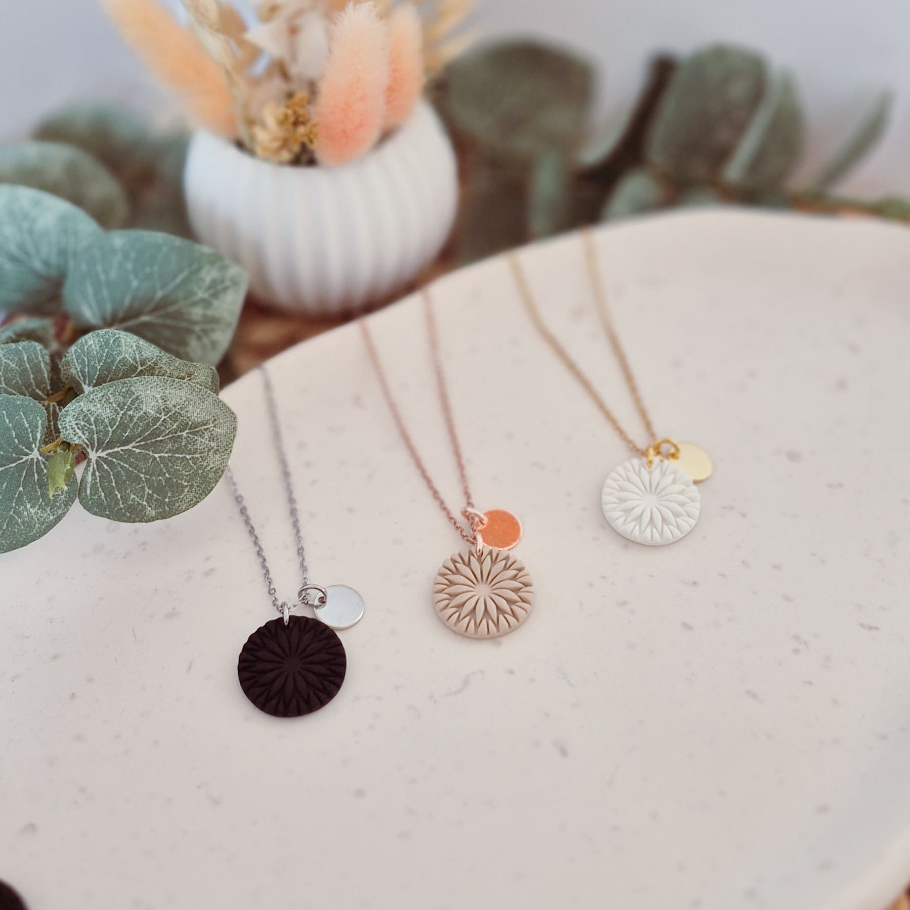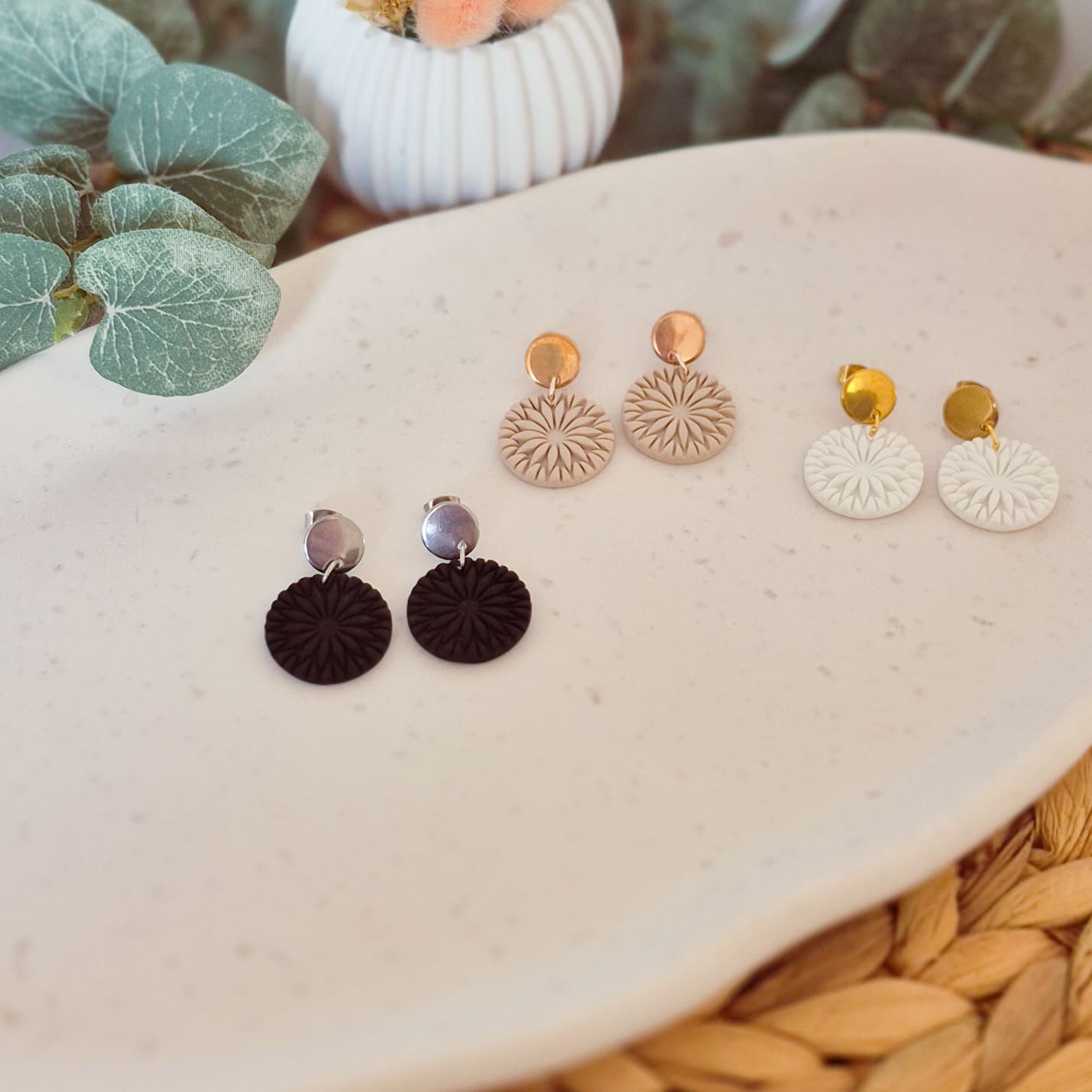 Die farbigen Elemente sind aus Polymer-Ton hergestellt, vielen von der Marke FIMO bekannt. Polymer-Ton ist unglaublich vielseitig und vor allem super leicht, was dir einen hohen Tragekomfort beschert.