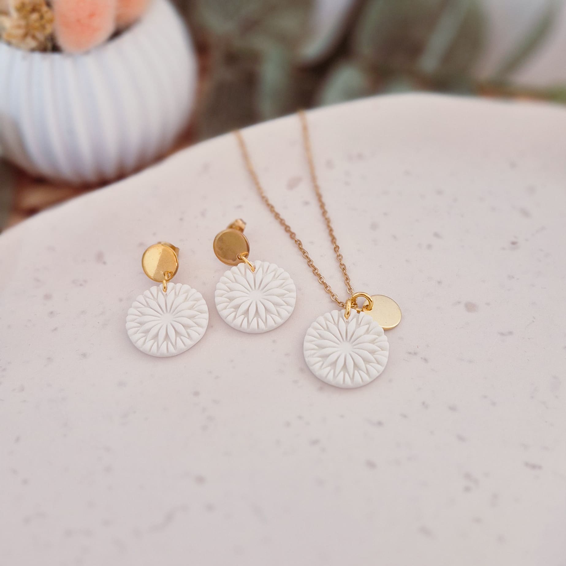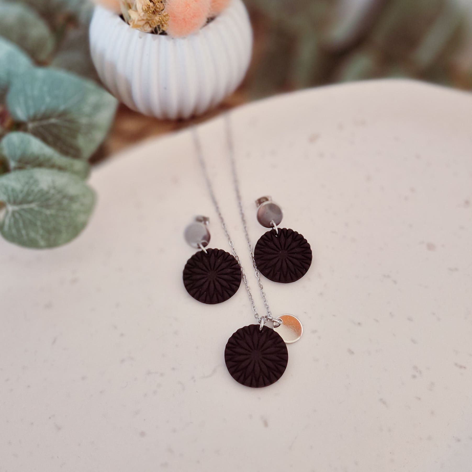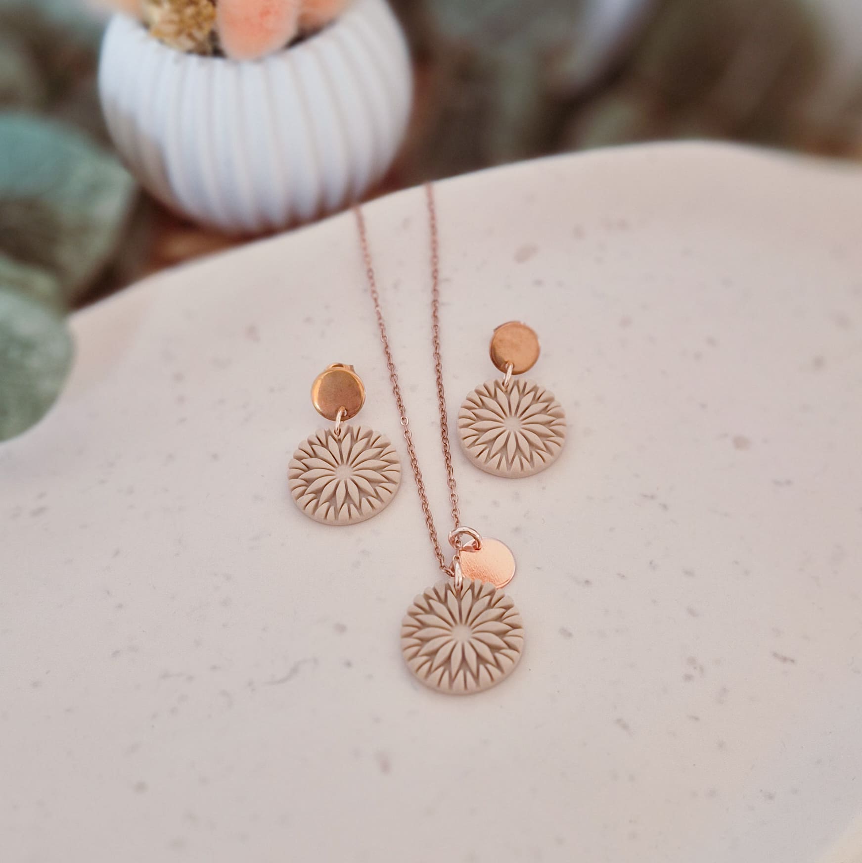 Verwendete Materialien: Polymer Ton, Ohrstecker und Halskette aus Edelstahl, Zier- und Verbindungsring aus Messing