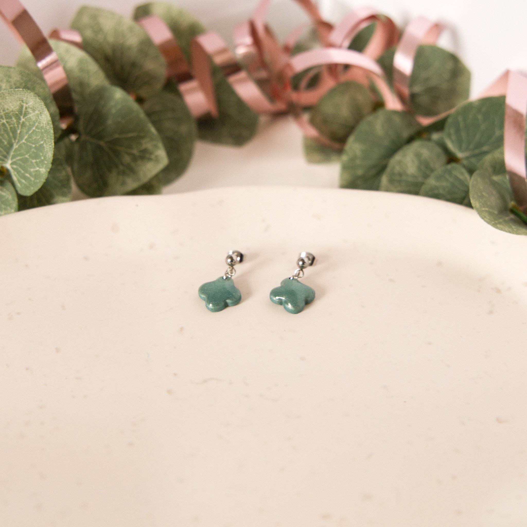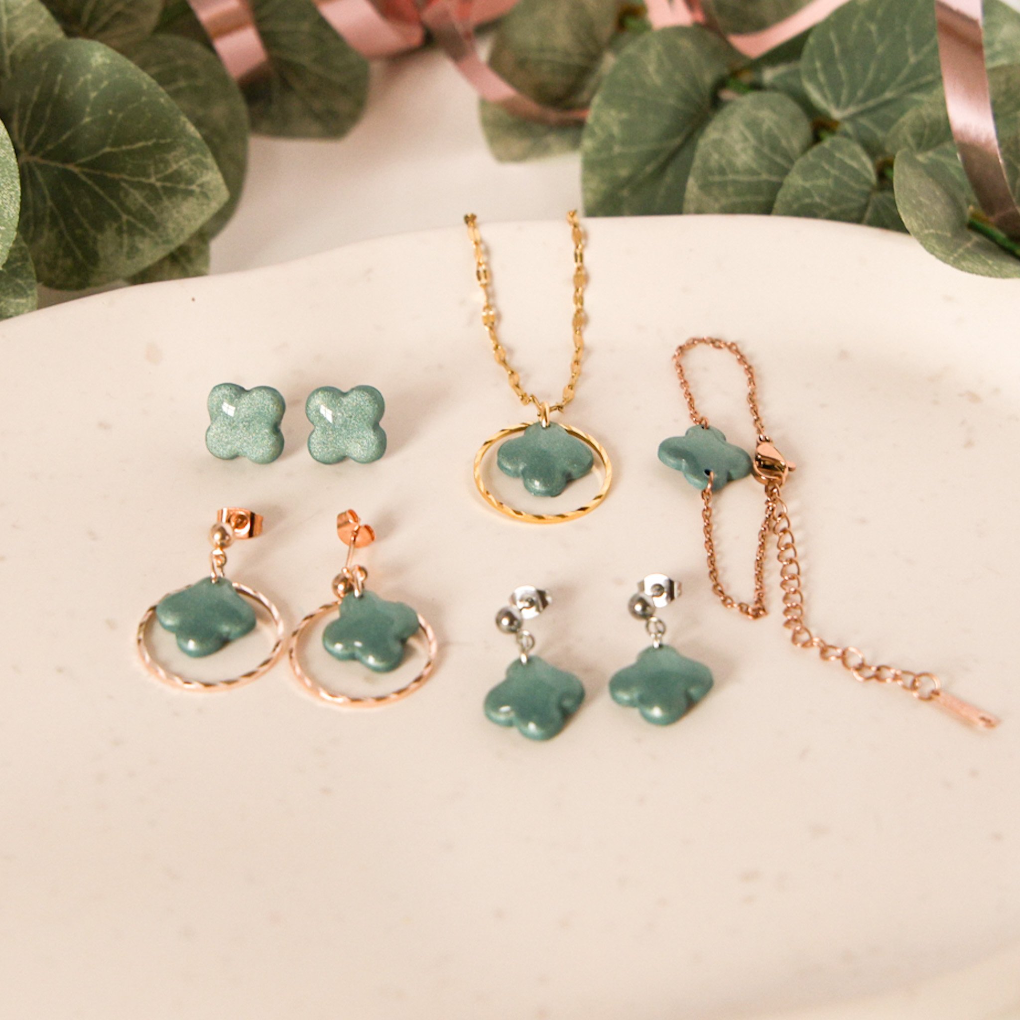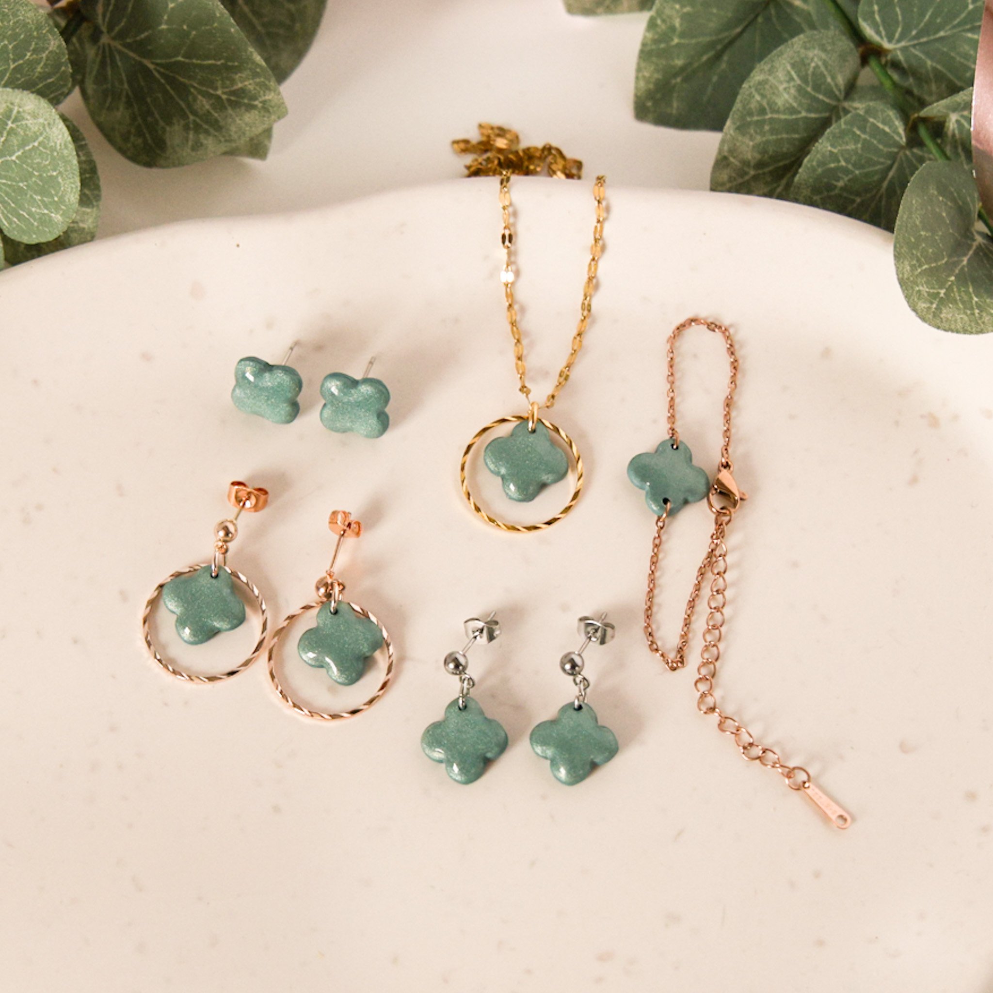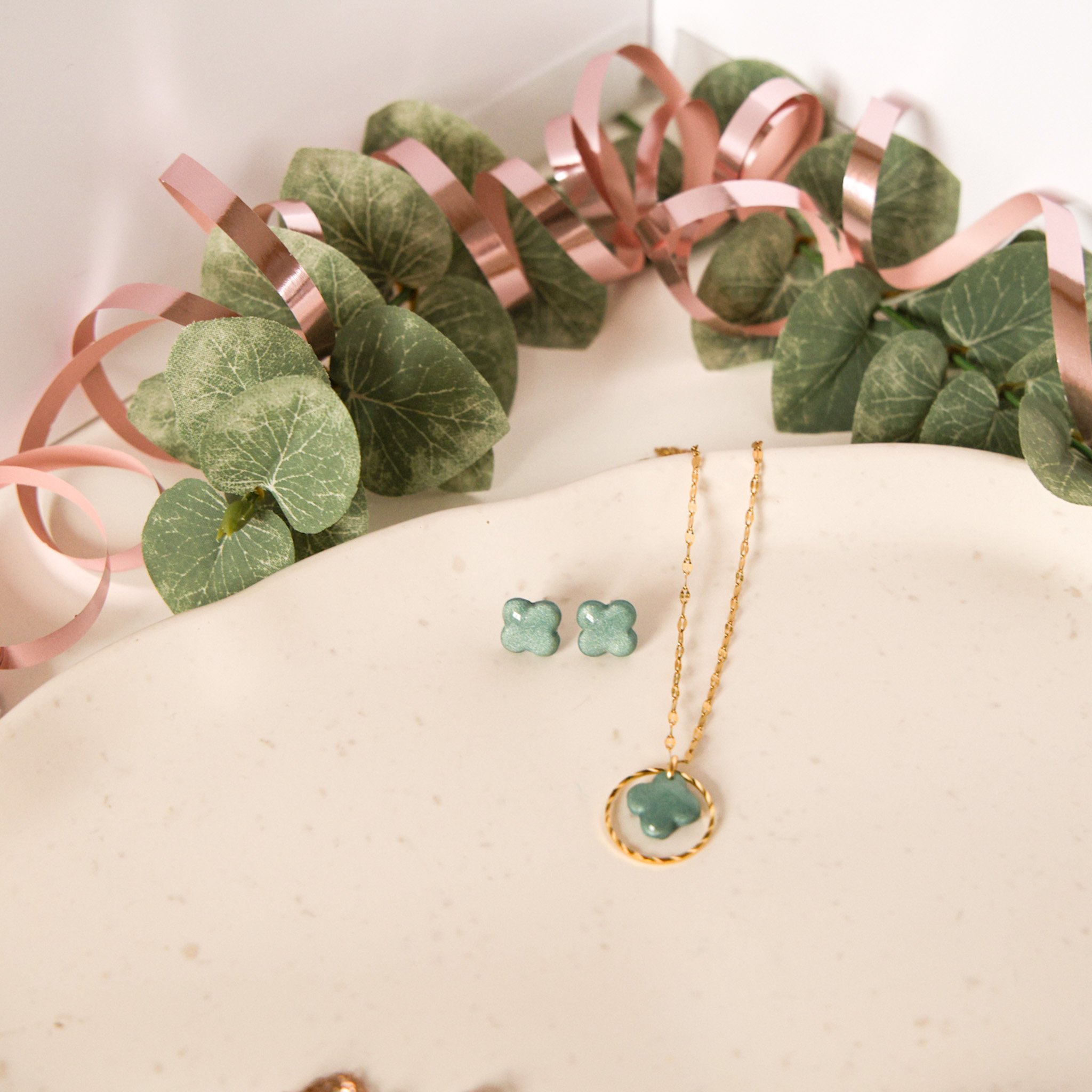 Ein Glücksklee fürs neue Jahr – wenn das nicht die perfekten Silvester-Schmuckstücke sind: Funkelnde Metallelemente mit elegant schimmerndem Salbeigrün! Du kannst dir dein Schmuckset ganz individuell zusammenstellen: Ohrstecker, Kette, schlichte und auffälligere Ohrringe stehen zur Auswahl.