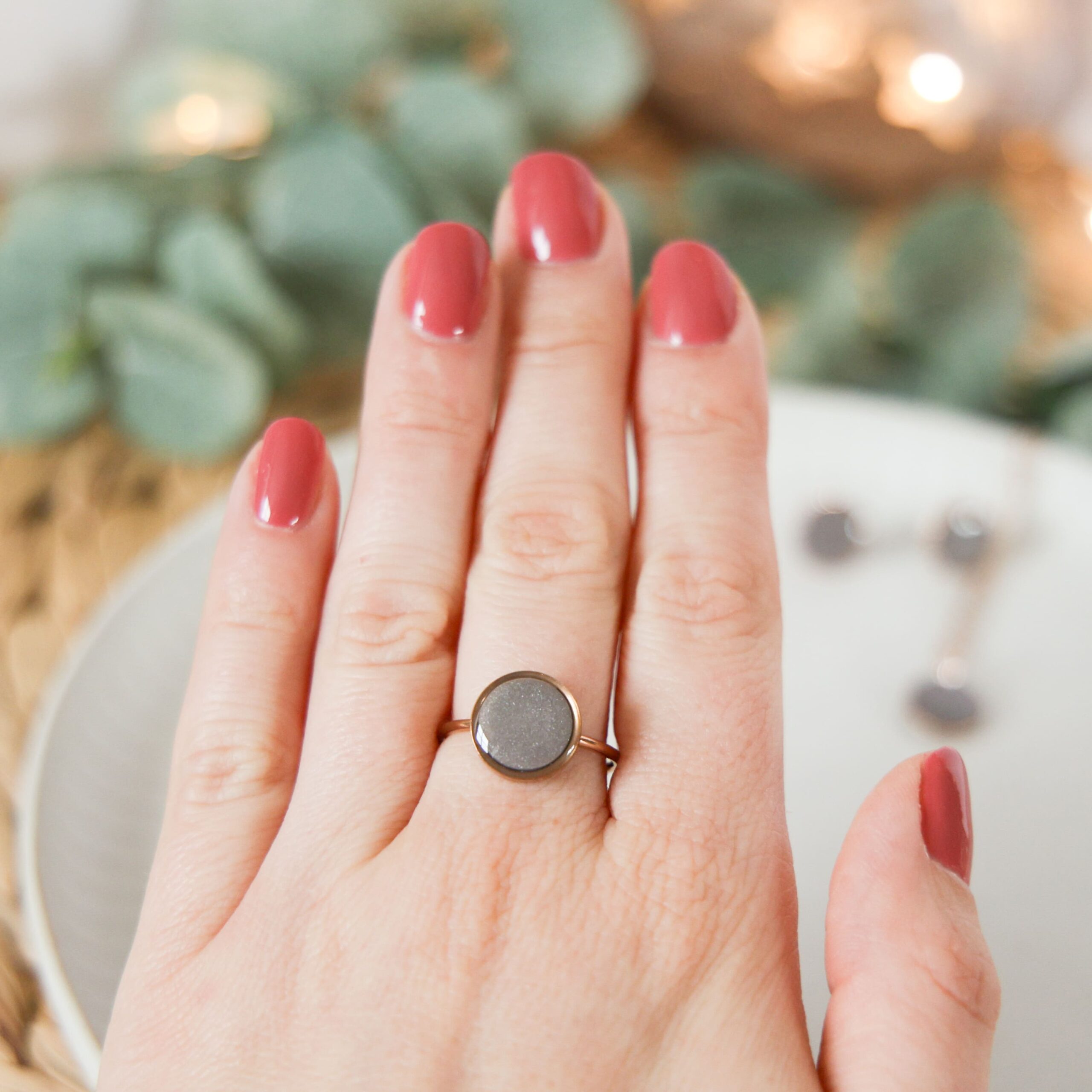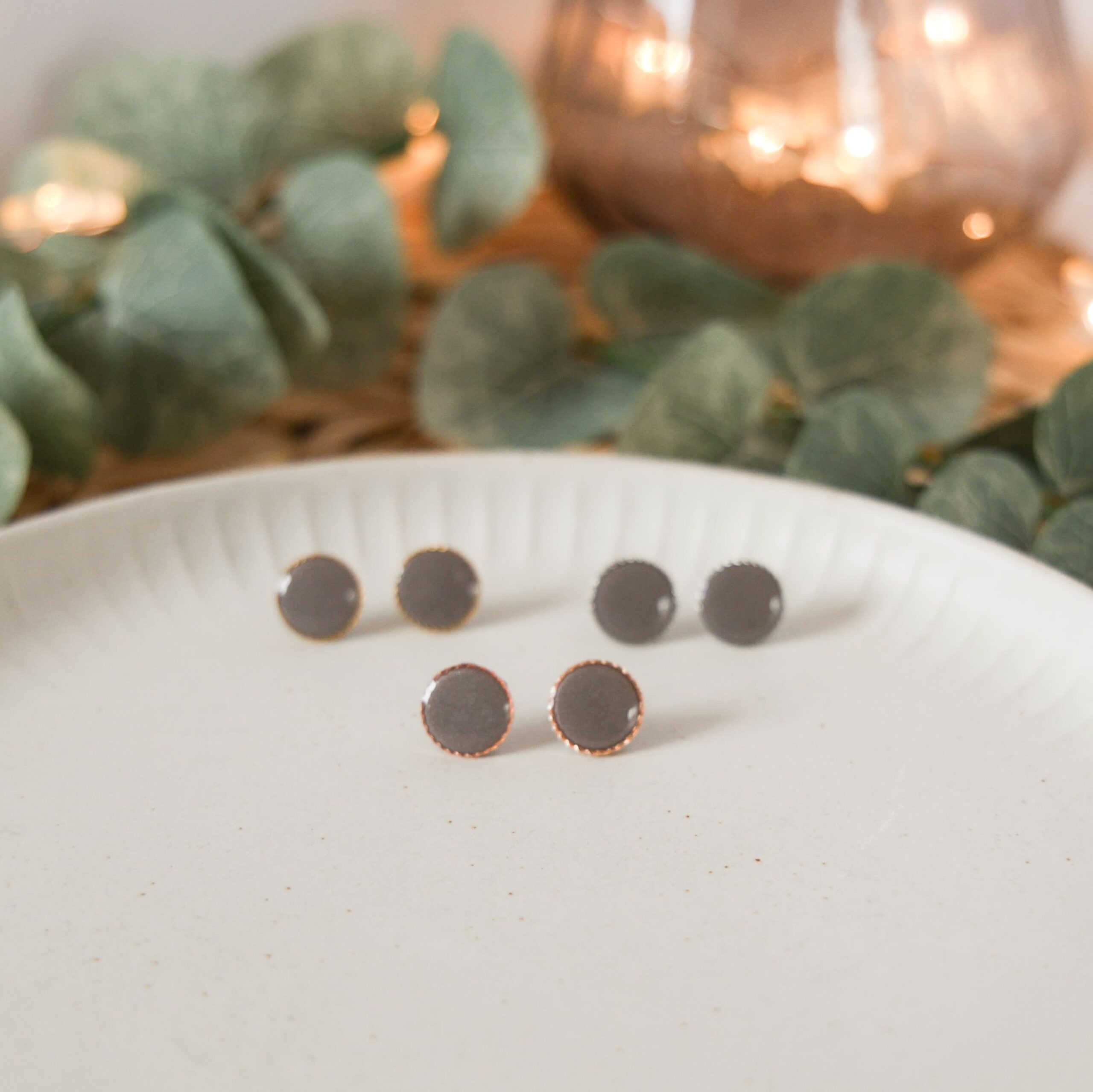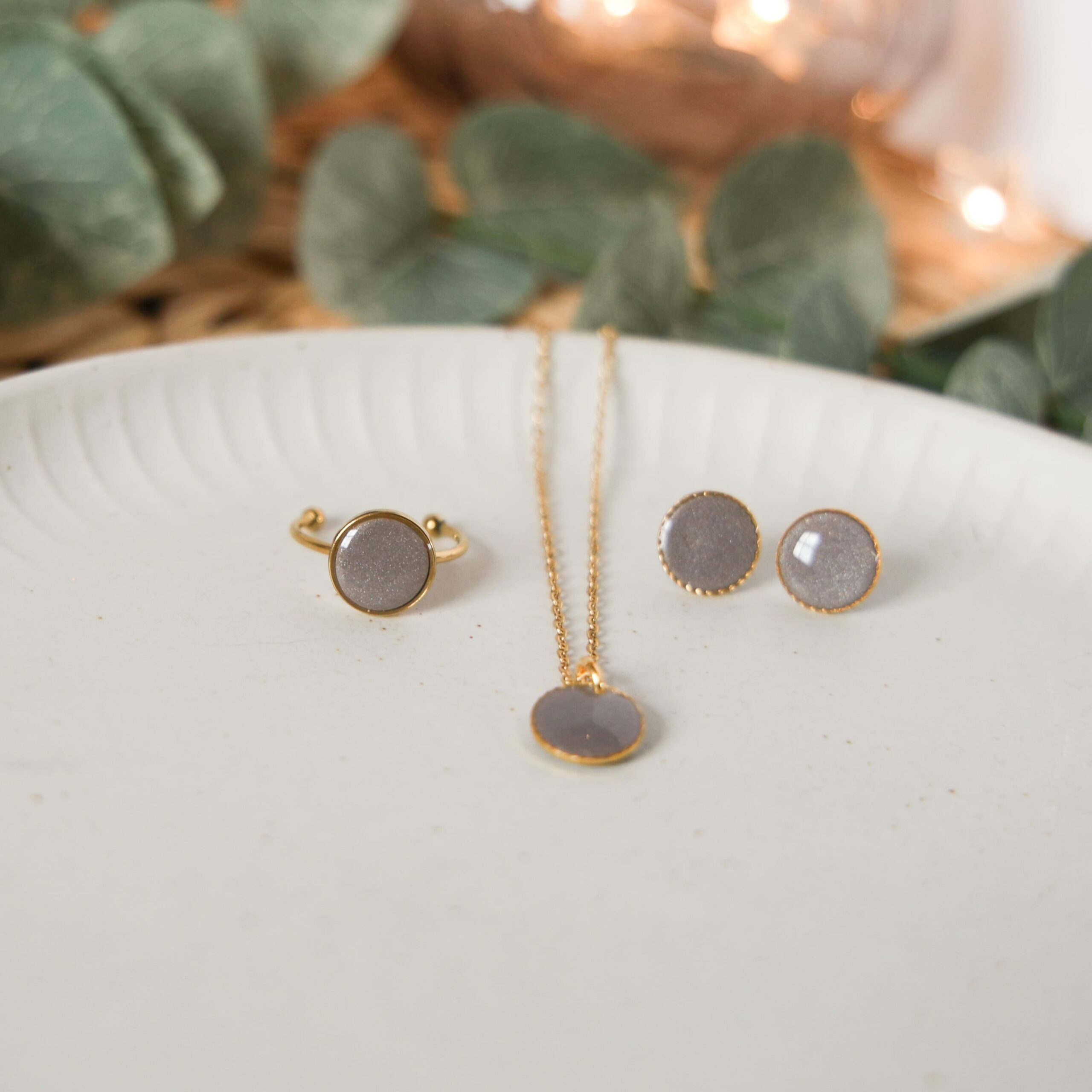 Neutrales Taupe mit einem dezenten Schimmer – ein absolutes Highlight für die Festtage! Das komplette Set besteht aus Ohrsteckern, Kette und größenverstellbarem Ring in deiner Wunsch-Metallfarbe.