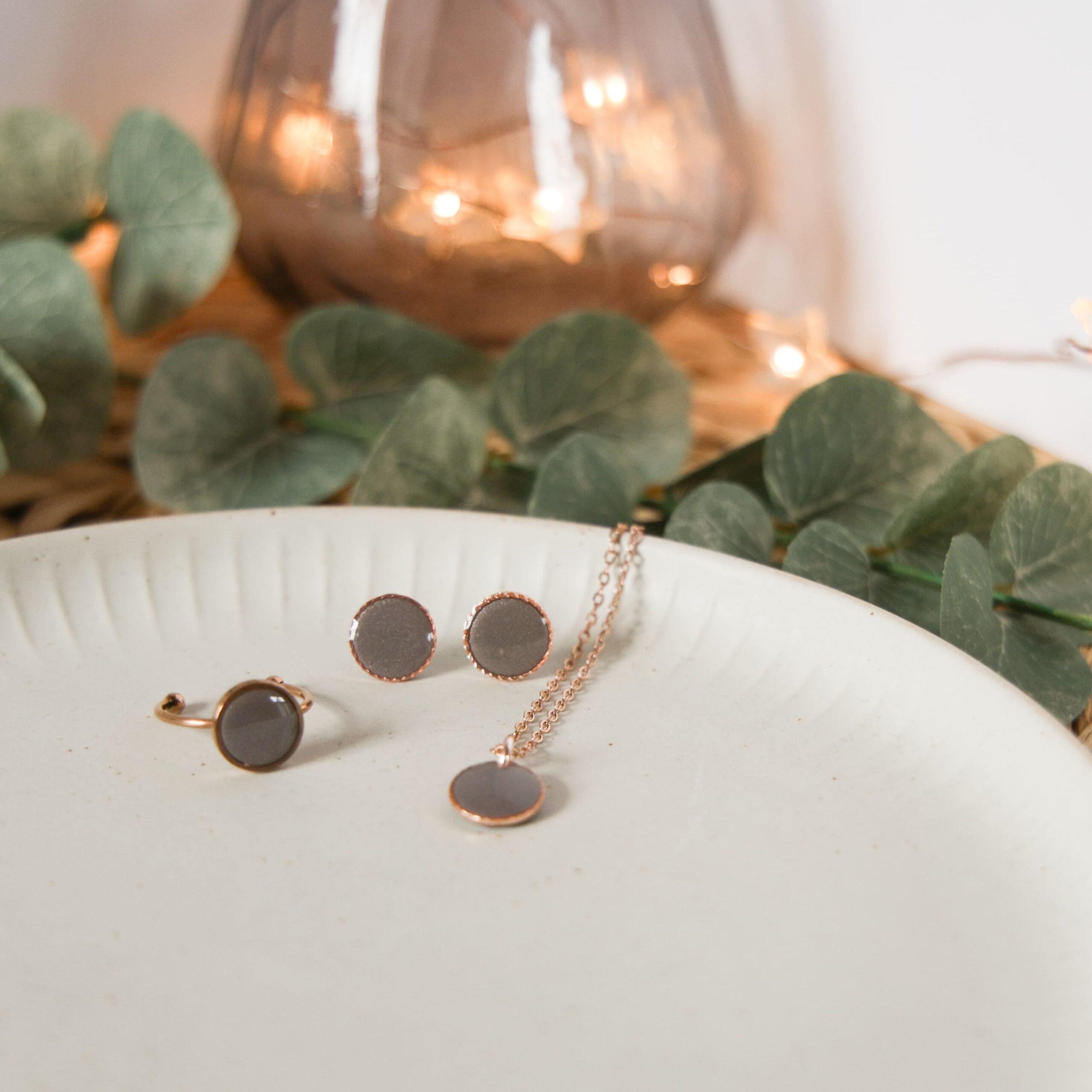 Ohrstecker 1,2 cm | Kette 45 cm, Anhänger 2,2 cm | Ring-Plättchen 1,2 cm