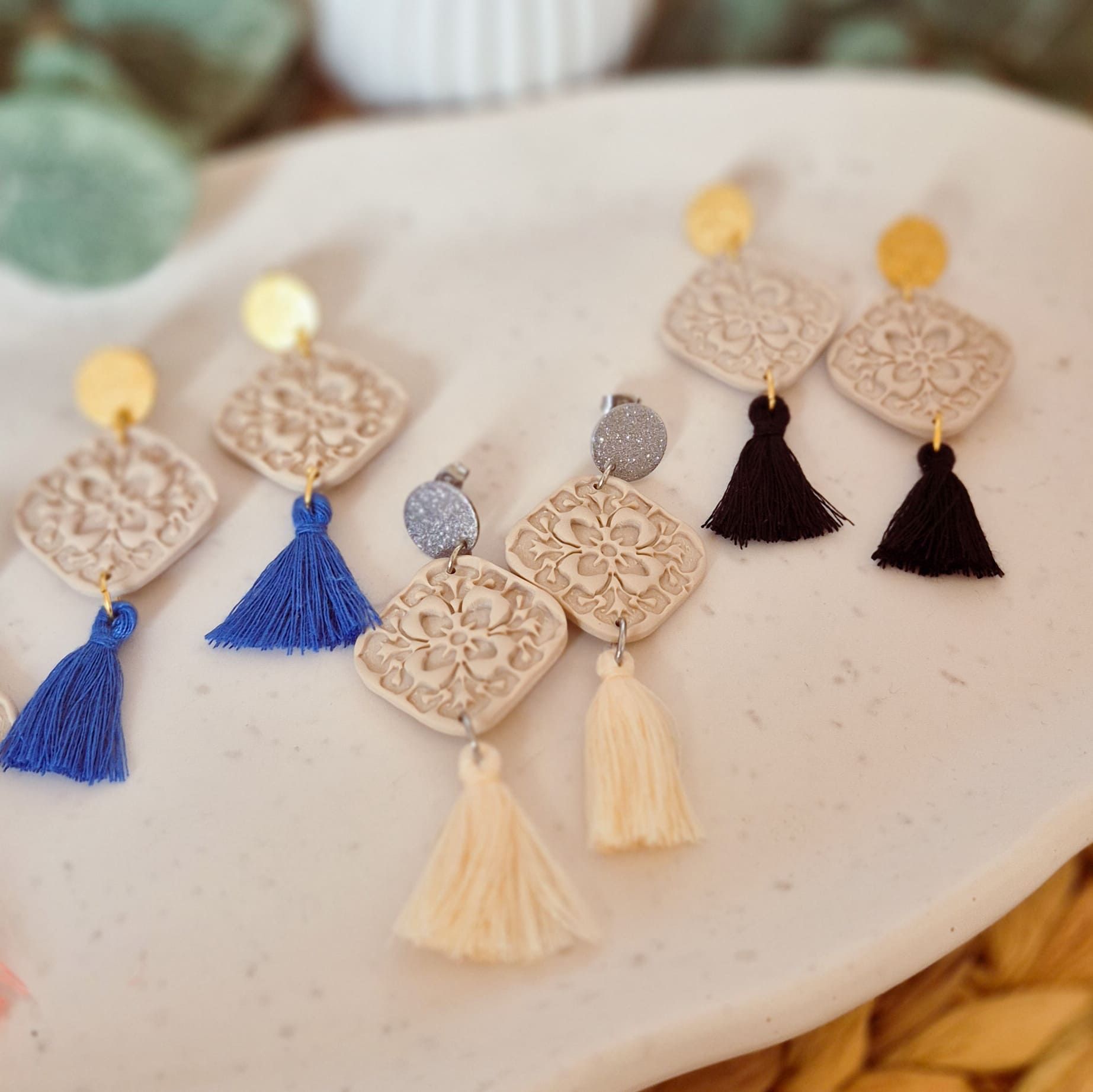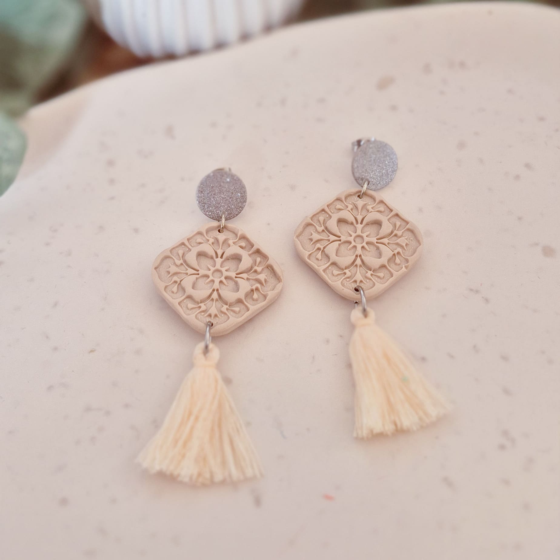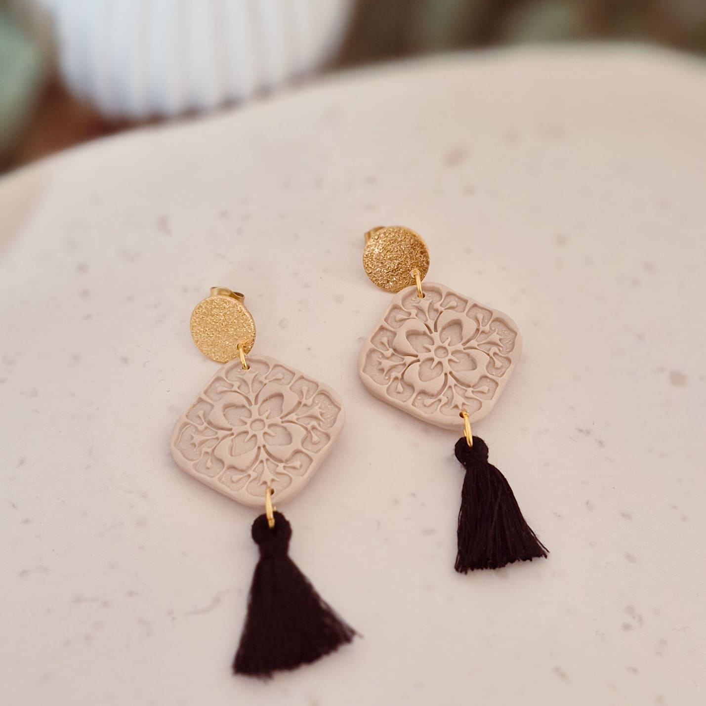 Du liebst große Ohrringe, sie sind dir aber oft zu schwer? Diese Statementohrringe mit beigem Anhänger mit Blüten Motiv und buntem Fransen sind federleicht und der absolute Hingucker! Die Fransen gibt es in verschiedenen tollen Farben: koralle, himmelblau, moosgrün, taupe, creme und schwarz.