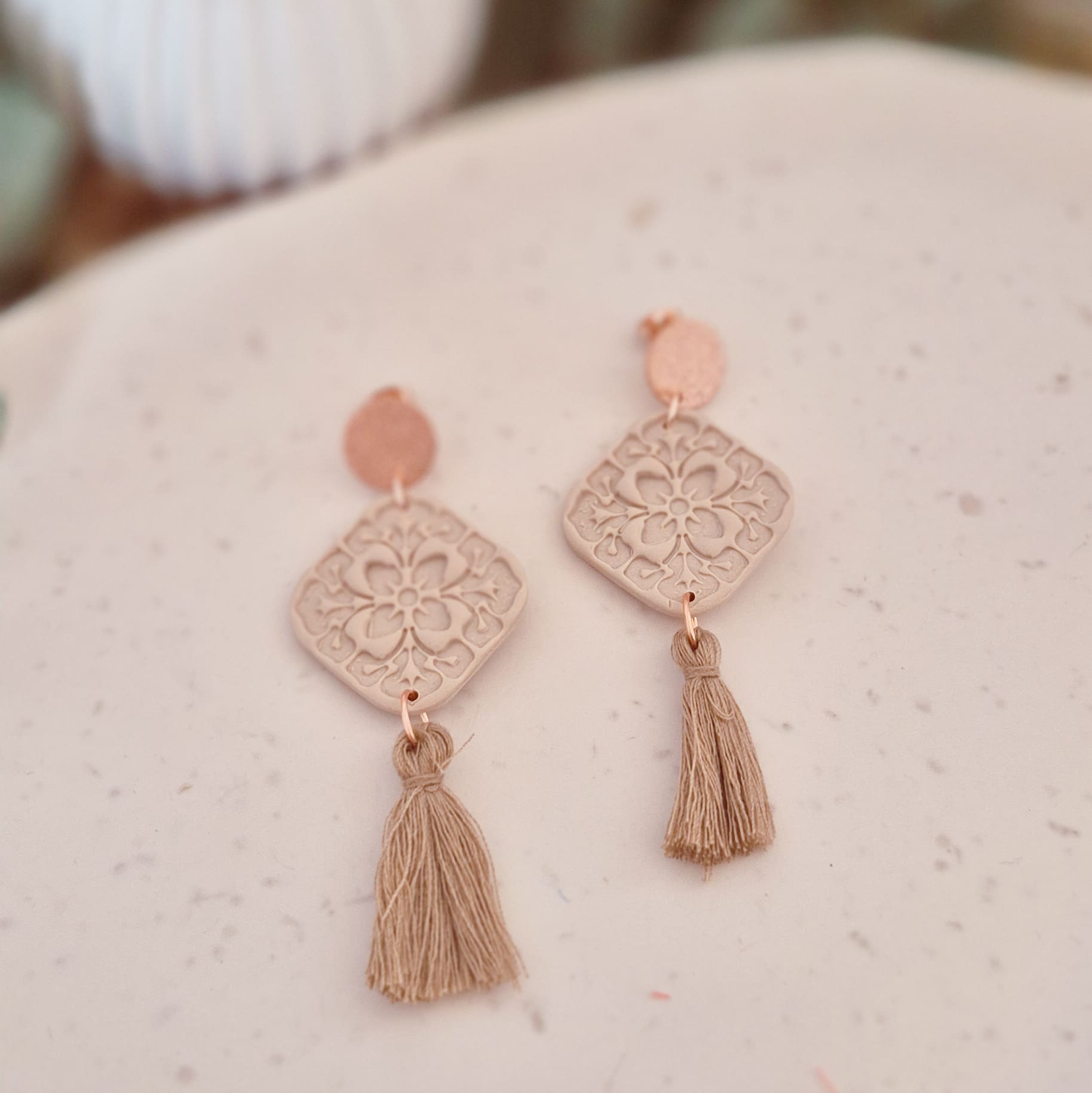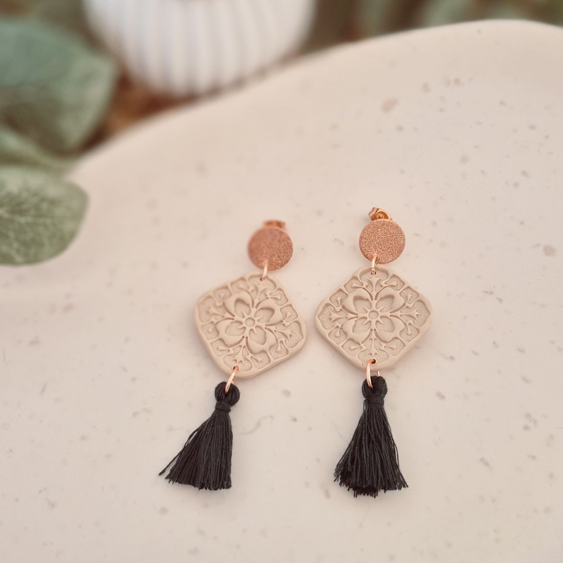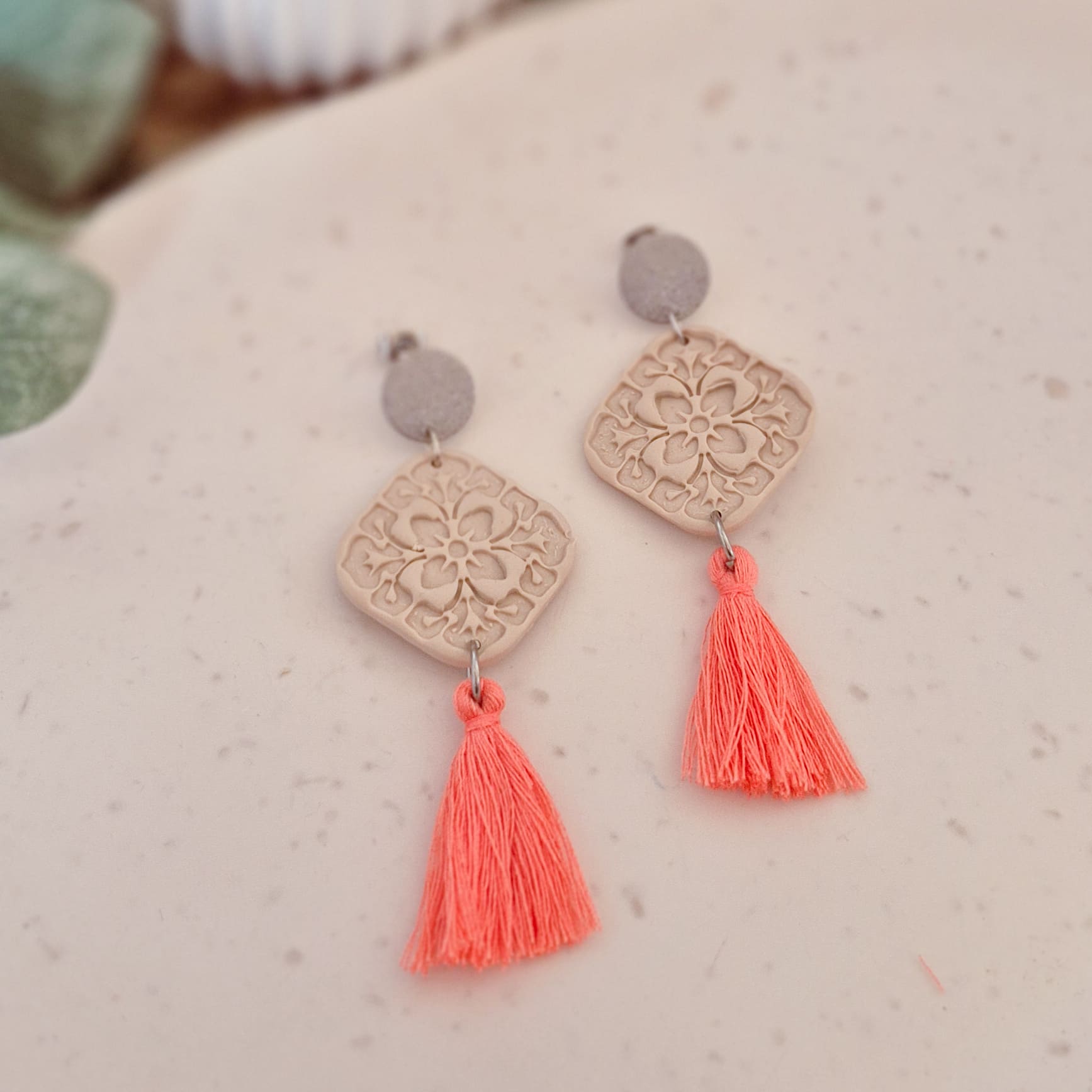 Du liebst große Ohrringe, sie sind dir aber oft zu schwer? Diese Statementohrringe mit beigem Anhänger mit Blüten Motiv und buntem Fransen sind federleicht und der absolute Hingucker! Die Fransen gibt es in verschiedenen tollen Farben: koralle, himmelblau, moosgrün, taupe, creme und schwarz.